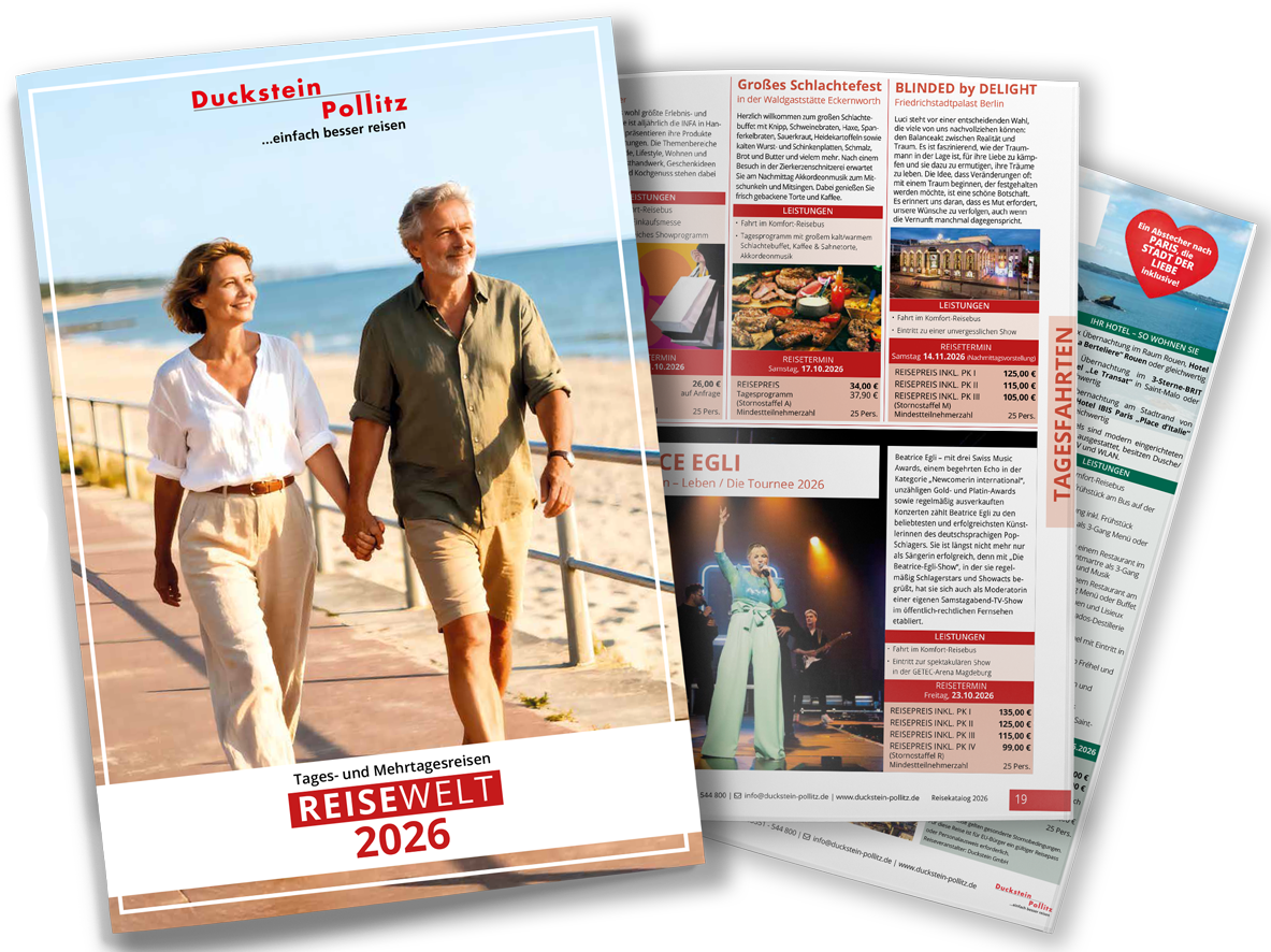 Duckstein-Pollitz ist Ihr persönlicher Partner für Busreisen. Die Auswahl ist vielfältig, von interessanten Städtereisen, erstklassigen Urlaubs- und Erlebnisreisen über Tagesfahrten bis hin zu individuellen Gruppenreisen.